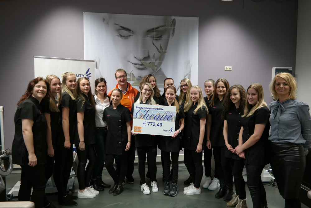 Meerdere klassen van het Beauty College haalden op de Goededoelendag geld op voor KIKA. Het resultaat is een prachtig bedrag van €772,40. Dinsdag 9 februari overhandigden zij de cheque officieel aan KIKA. Het Beauty College is een mbo-college van ROC Midden Nederland in Utrecht.